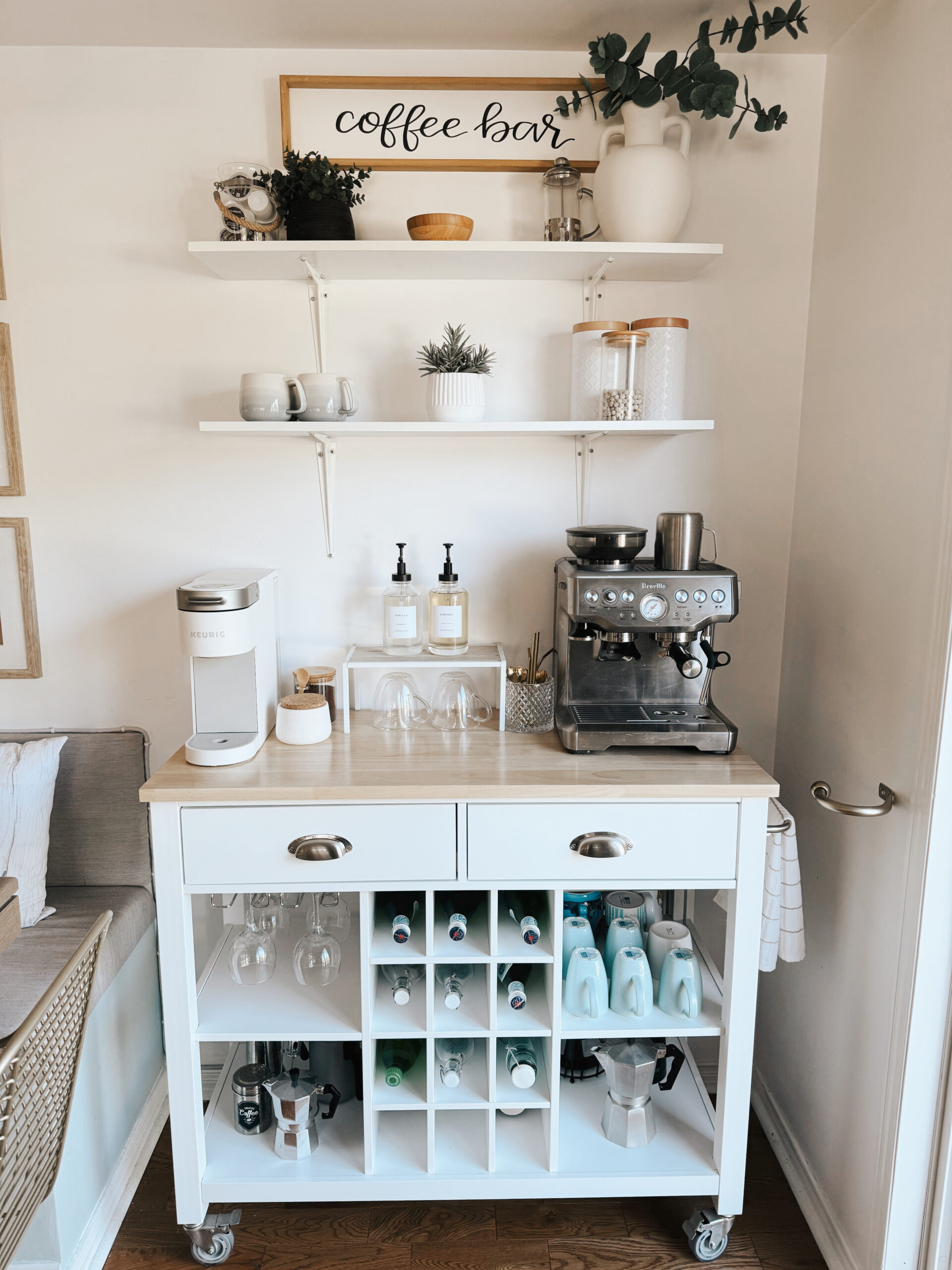 To add more counter space, we added a portable kitchen island as our coffee station. We love how it has built-in storage for all our coffee essentials. Store your coffee beans and sugar in cute containers or jars. Clear canisters or chic ceramic jars not only keep ingredients fresh but also add to the aesthetics.